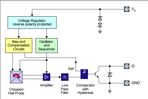 切碎的霍爾IC開關(guān)包括霍爾探頭,偏置發(fā)生器,補償電路,振蕩器和輸出晶體管。
