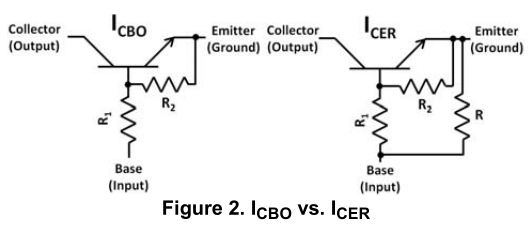 對(duì)于數(shù)字晶體管,重要的是要認(rèn)識(shí)到晶體管和電阻網(wǎng)絡(luò)被認(rèn)為是一個(gè)單元。 其示例是I CBO參數(shù)。 看看這個(gè)參數(shù),人們會(huì)認(rèn)為這是不可能的。 當(dāng)R 2連接晶體管的發(fā)射極和基極時(shí),發(fā)射極怎么能打開? 不應(yīng)該是CER嗎? 答案是肯定R 2連接晶體管的發(fā)射極和基極,但這種連接內(nèi)置于器件中。 什么被認(rèn)為是數(shù)字晶體管的發(fā)射極和基極是開放的。 在數(shù)字晶體管的情況下,I CER意味著在數(shù)字晶體管的發(fā)射極和基極之間存在另外的電阻器。 圖2顯示了在參考數(shù)字晶體管時(shí)I CBO和I CER之間的差異。