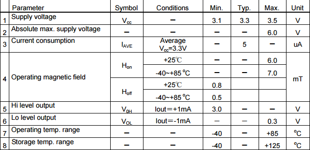 注4)本產(chǎn)品的靈敏度選擇是在Vcc = 3.3V的條件下進行的。 在設計中需要特別注意應用技術(shù)協(xié)助時的工作磁場。