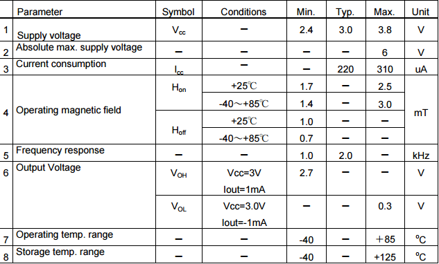 注3)在將傳感器輸出從H轉(zhuǎn)換為L時,請確保在設(shè)計中施加在傳感器上的磁場低于上述工作磁場(Hoff)。