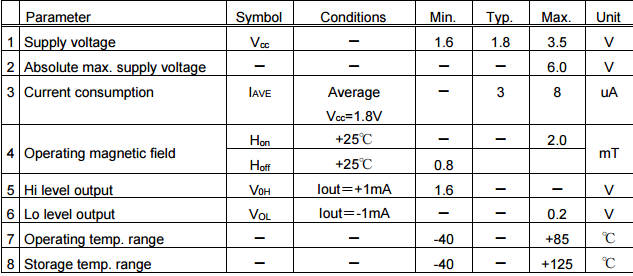 注意3)在將傳感器輸出從L轉(zhuǎn)換為H時,請確保在設(shè)計中施加在傳感器上的磁場低于上述工作磁場(Hoff)。