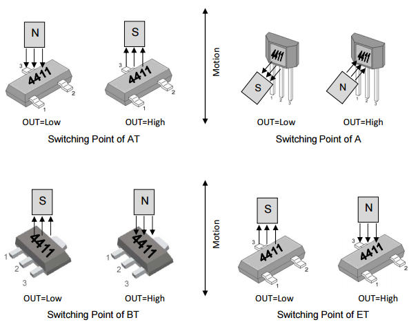 采用雙極技術(shù)生產(chǎn)的MT4411系列?;魻朓C內(nèi)部包括一個片上霍爾電壓發(fā)生器,一個可在3.0至30V的電源電壓下工作的穩(wěn)壓器,反向保護(hù)二極管,溫度補償電路,小信號放大器,施密特觸發(fā)器和帶上拉功能的輸出驅(qū)動器電阻器。它們被設(shè)計為響應(yīng)南北極交替。當(dāng)磁通密度(B)大于工作點(BOP)時,輸出將打開(Low),保持輸出直到磁通密度(B)低于釋放點(BRP),然后轉(zhuǎn)向關(guān)(高)。