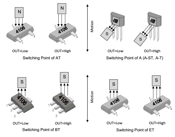 MT4106系列,采用雙極技術(shù)生產(chǎn),霍爾IC內(nèi)部包括一個(gè)片上霍爾電壓發(fā)生器,一個(gè)可在3.8至30V的電源電壓下工作的穩(wěn)壓器,反向保護(hù)二極管,溫度補(bǔ)償電路,小信號(hào)放大器,施密特觸發(fā)器和集電極開(kāi)路輸出。它們?cè)O(shè)計(jì)用于響應(yīng)一個(gè)極點(diǎn):北極(AT)或南極(A,BT和ET)。當(dāng)磁通密度(B)大于工作點(diǎn)(BOP)時(shí),輸出將打開(kāi)(低),而磁通密度(B)低于釋放點(diǎn)(BRP),然后關(guān)閉(高) MT4106系列可為客戶(hù)提供各種封裝:用于表面安裝的SOT-23 / SOT-89B和用于通孔安裝的扁平TO-92。所有包裝均符合RoHS。